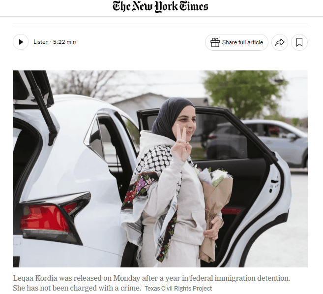 This post is a foundational piece about protected speech and actions on public college campuses. We live in a time where speech is being aggressively destroyed. Two days ago, March 16, 2026, Leqaa Kordia was released from being jailed for A YEAR in federal immigration detention. She has not been charged with a crime. She took part in a pro-Palestinian demonstration at Columbia University in 2024.